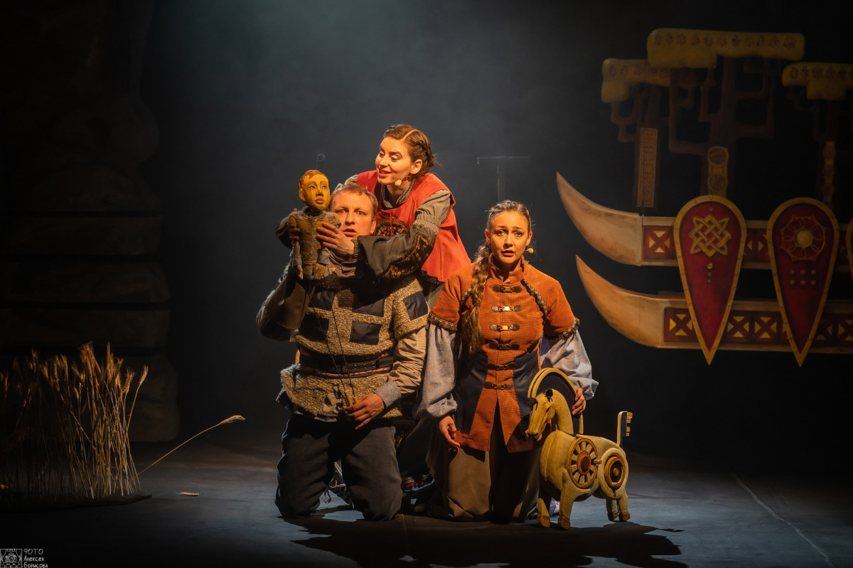 В спектакле использованы штоковые марионетки, гапитно-тростевые и планшетные куклы. Артисты работают в живом плане.