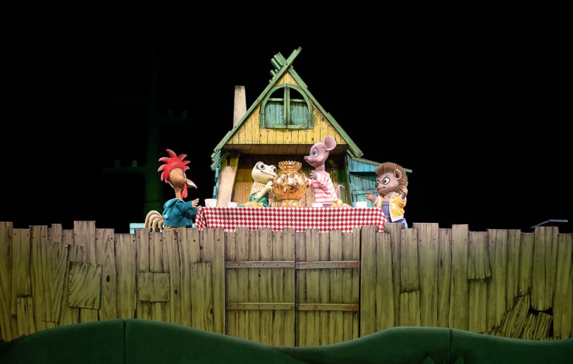В спектакле использованы перчаточные и ростовые куклы. Артисты работают на ширме и «в живом плане».