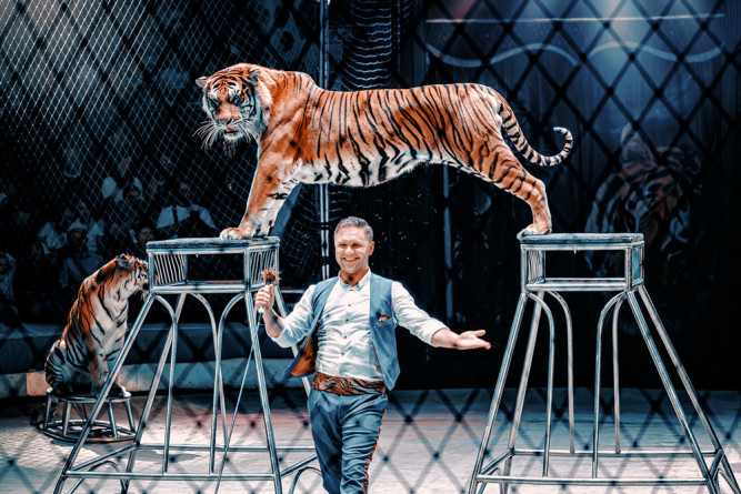 Новая программа, при участии потомственного артиста старейшей династии в пятом поколении Ярослава Запашного с аттракционом «Тигры на земле и в воздухе».