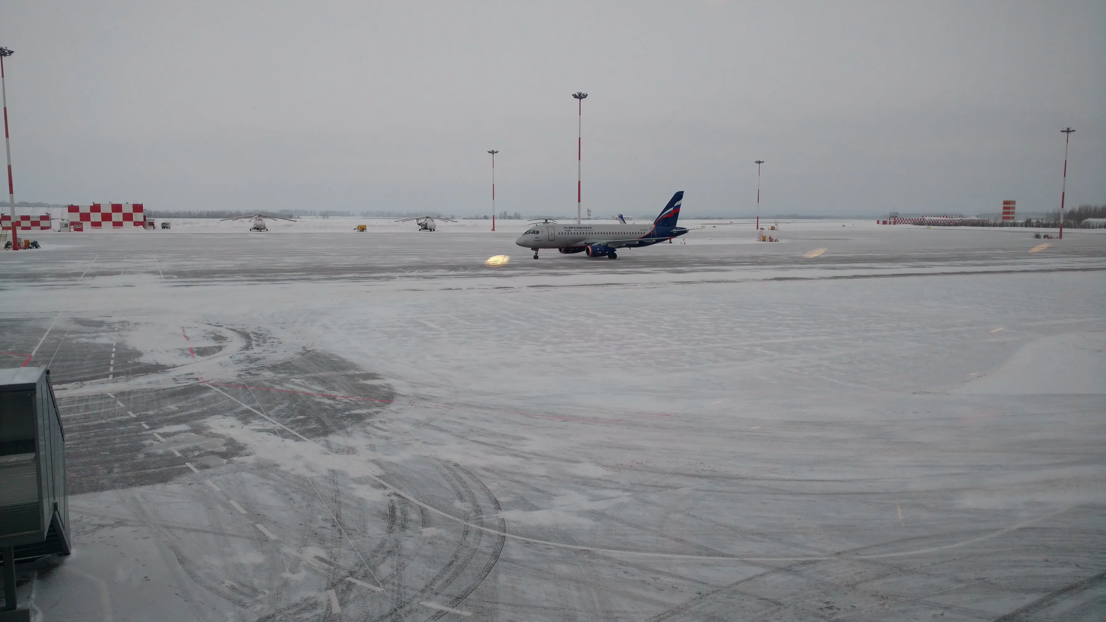 Утром высота снежного покрова в районе аэродрома превышала 40 сантиметров. Для расчистки взлетно-посадочной полосы и перрона используется вся необходимая специализированная техника, работающая в непрерывном режиме.