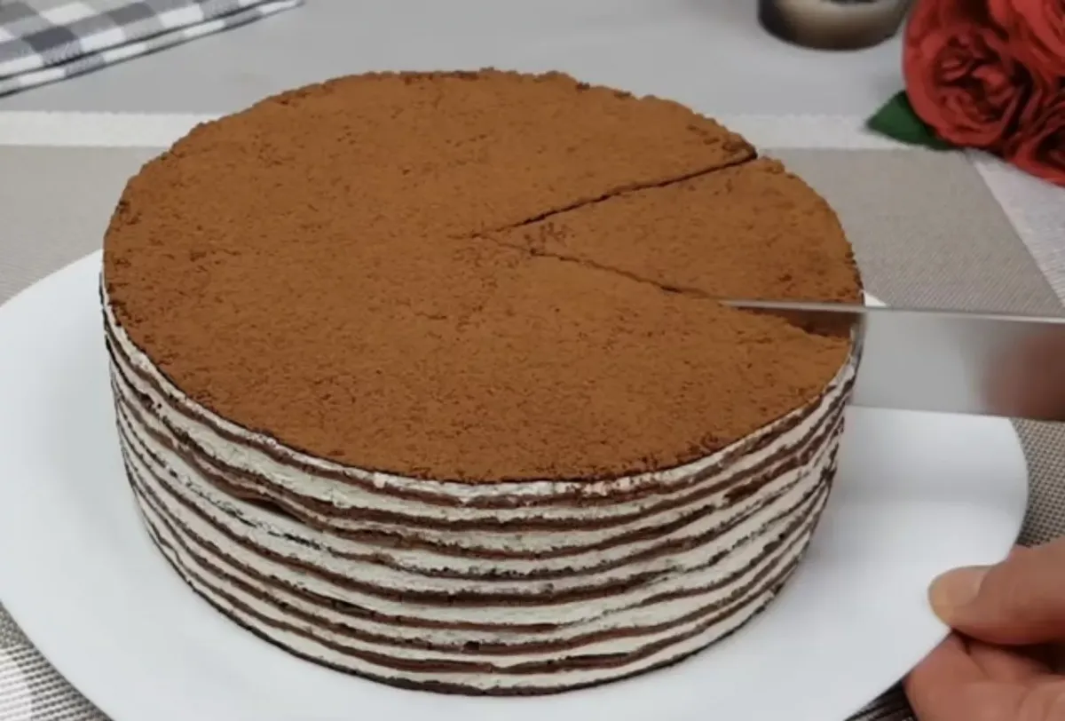 Для сборки торта каждый блин обильно смазывайте кремом, укладывая их друг на друга. Верхний блин также покройте кремом и посыпьте какао. Поставьте торт в холодильник на 2 часа, и ваш десерт будет готов. Приятного аппетита!