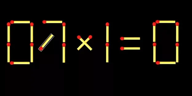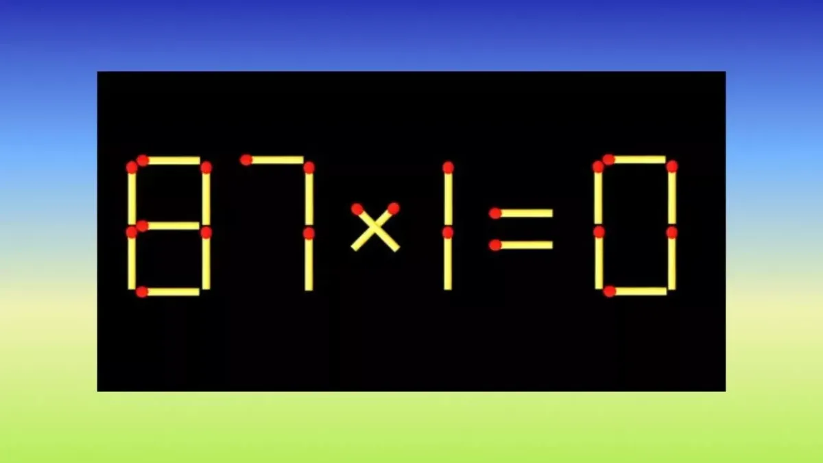 На картинке представлено выражение, составленное из спичек: "87×1=0". Ваша задача — переместить всего одну спичку, чтобы исправить это уравнение. Обратите внимание, что это задание требует особого внимания и нестандартного подхода!