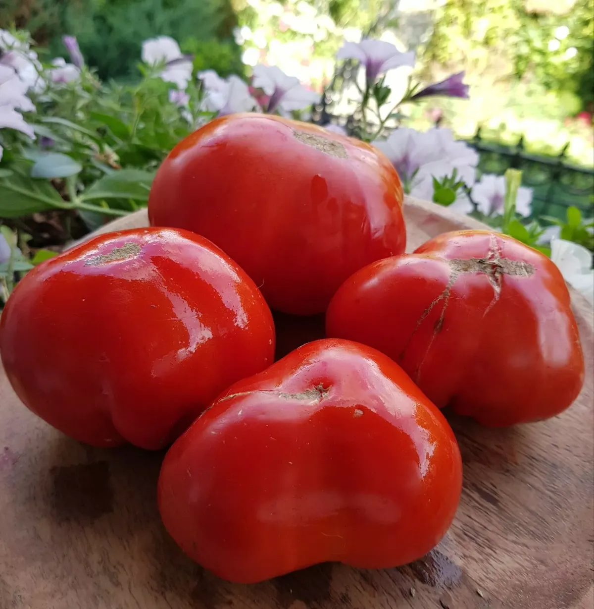 Первая кисть с плодами формируется после 7-го листа, а последующие появляются через каждые два листа. На одной кисти может завязаться до 6 крупных томатов. Мякоть плодов умеренно плотная, с небольшим количеством семян. Все томаты имеют ярко-красный цвет и сердцевидную форму. Кожица тонкая, а вкус — насыщенный, с легкой сладостью и кислинкой.