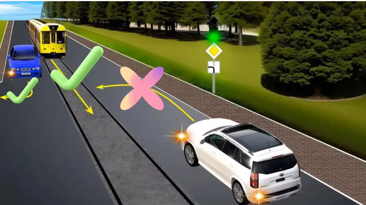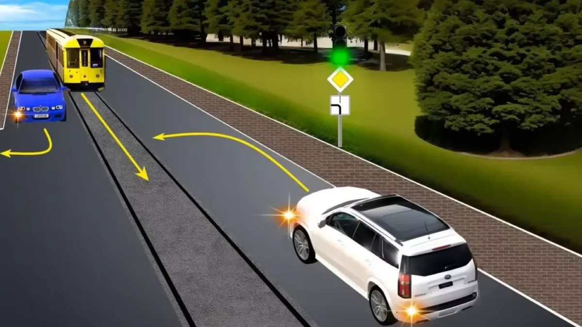 Согласно пункту 16.7 ПДД, «если сигнал регулировщика или зеленый сигнал светофора позволяют одновременно движение трамвая и нерельсовых транспортных средств, трамваю отдается предпочтение независимо от направления его движения». Это означает, что водитель белого автомобиля обязан уступить дорогу трамваю. Но как обстоят дела с синим автомобилем? Пункт 16.6 ПДД уточняет: «поворачивая налево или разворачиваясь при зеленом сигнале основного светофора, водитель нерельсового транспортного средства обязан дать дорогу трамваю попутного направления, а также транспортным средствам, которые двигаются во встречном направлении прямо или поворачивают направо».