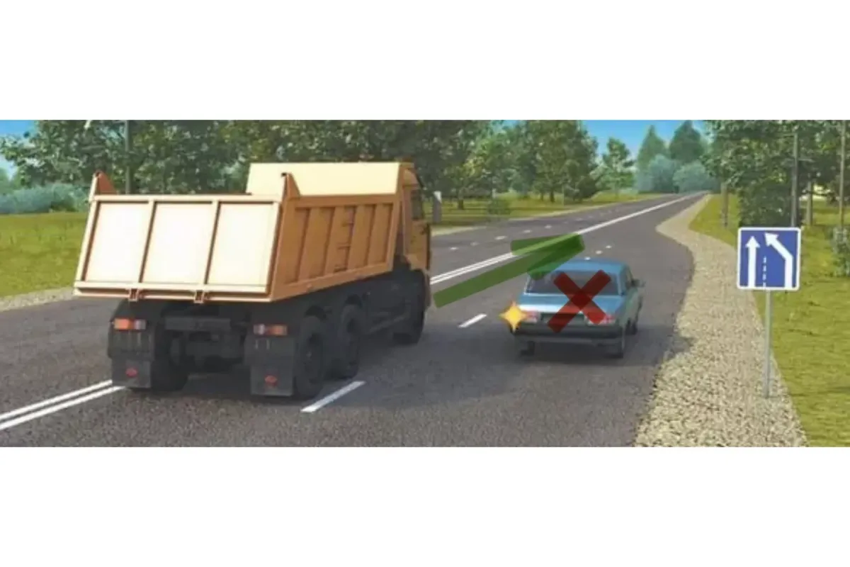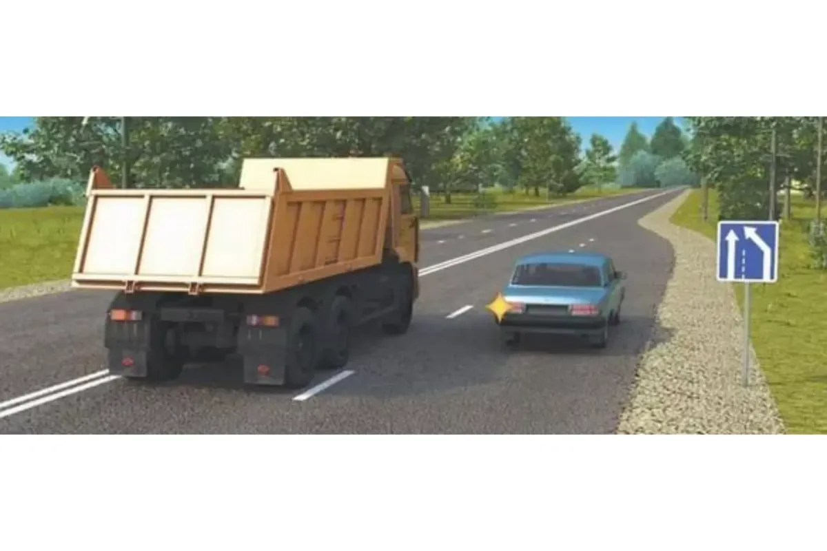 На изображении представлена дорожная ситуация, в которой два транспортных средства собираются двигаться по одной полосе. В таком случае, одному из них необходимо уступить дорогу. Но кто именно должен это сделать? Давайте проверим, насколько хорошо вы знаете правила дорожного движения.