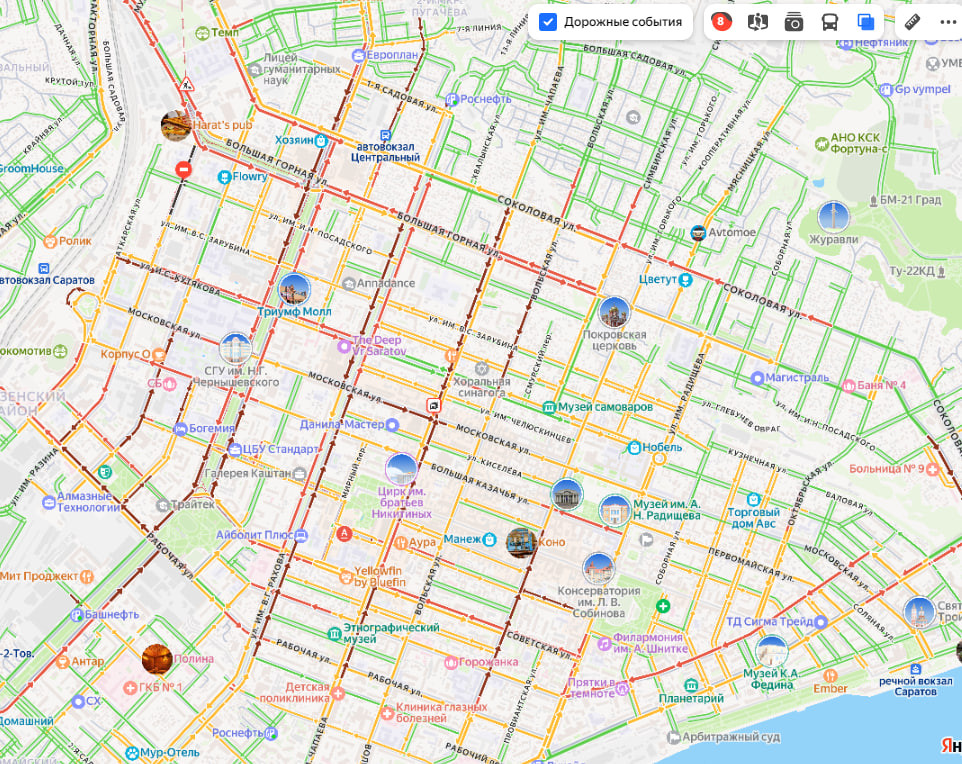 Ситуация на дорогах усугубляется семью авариями и сильным снегопадом. Заторы наблюдаются в районе «СГУ», «Триумф Молла» и почти на всей улице Мичурина.