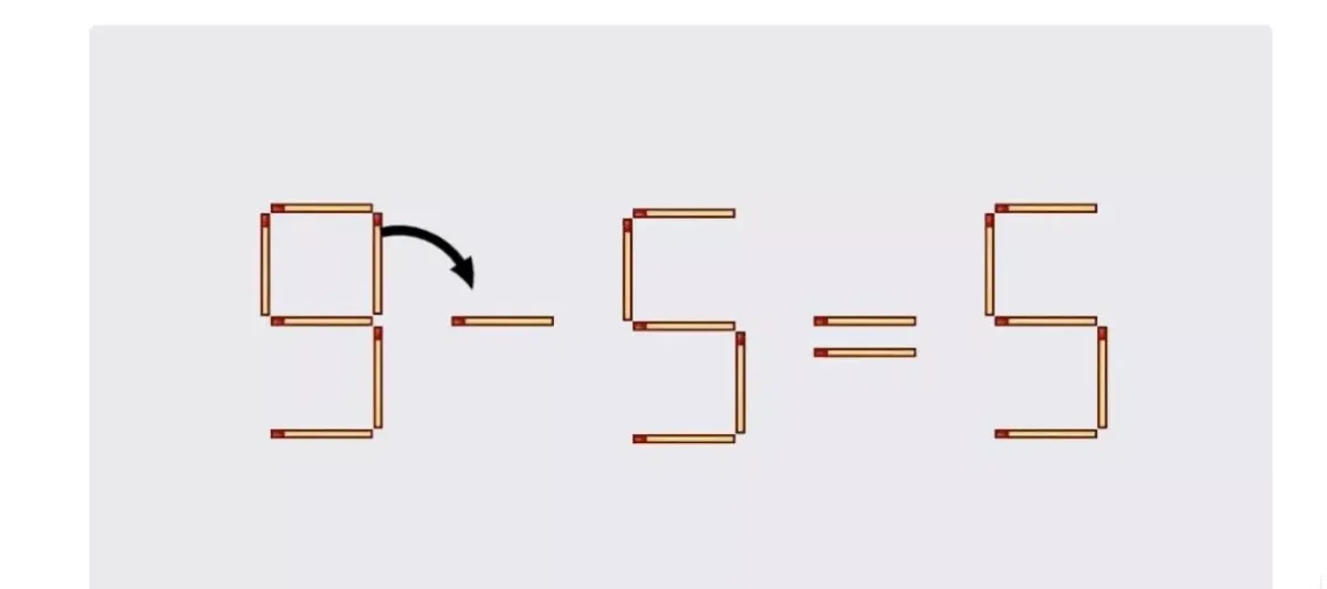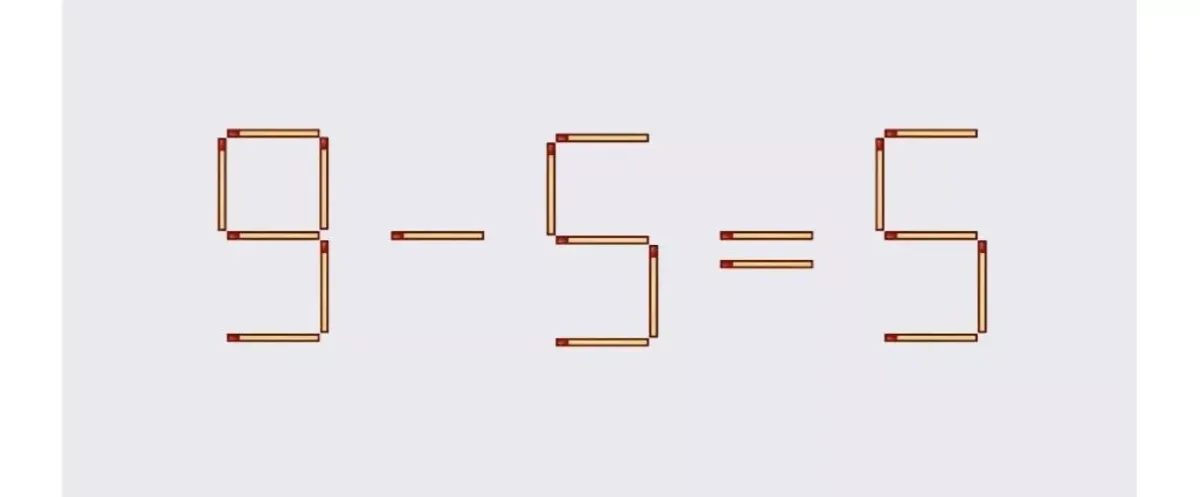 Сегодня мы предлагаем вам увлекательную загадку с использованием спичек. Ваша задача — переместить всего одну спичку в уравнении 9−5=5, чтобы сделать его правильным. На данный момент это равенство неверно, так как художник искусно замаскировал правильный ответ.