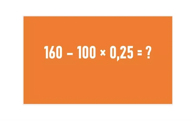 Сколько будет: 160 — 100 ⋅ 0,25 = ?