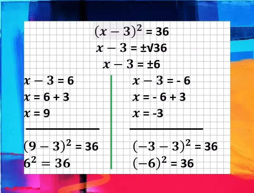 Таким образом, уравнение (x — 3) ² = 36 имеет два корня: 9 и -3. Если подставить эти значения обратно в уравнение (что мы сделали под чертой), в обоих случаях получится 36.