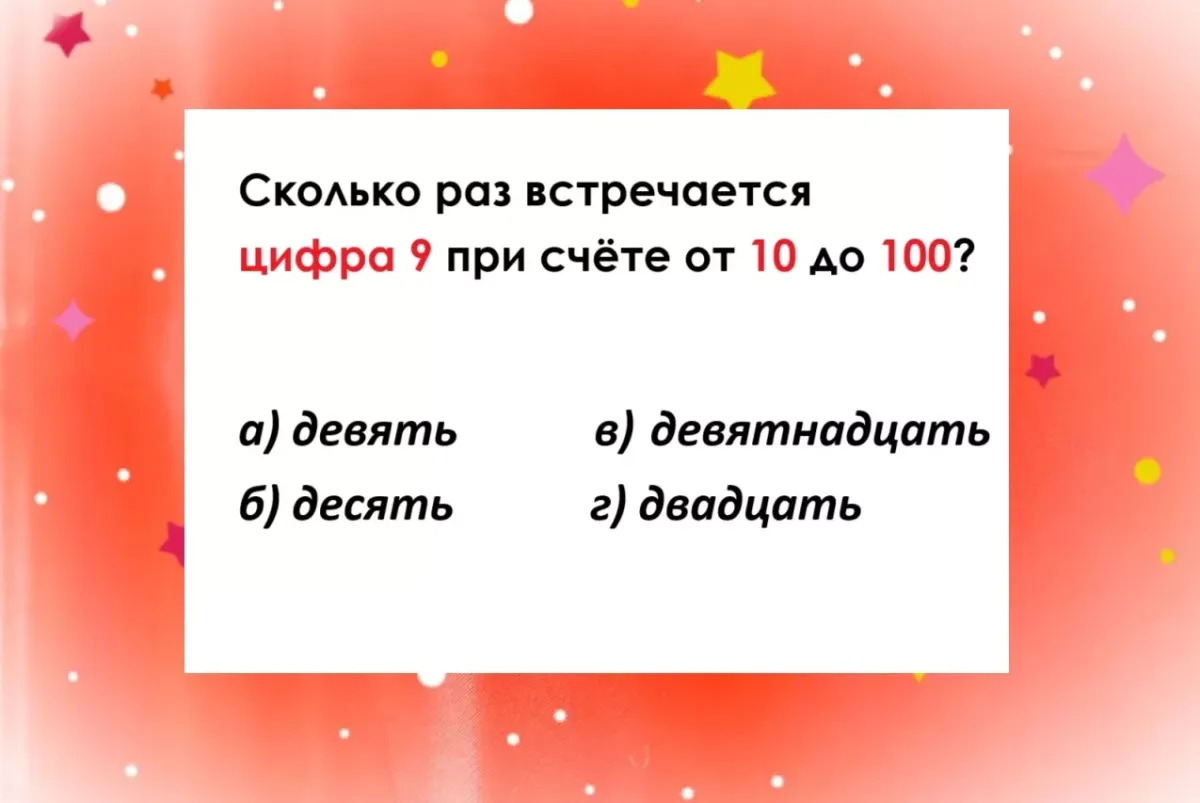 Сколько раз цифра 9 встречается при счете от 10 до 100? а) девять; б) десять; в) девятнадцать; д) двадцать.