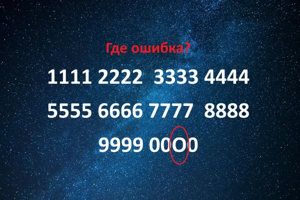 Как видно, среди цифр «0» затесалась буква «О», которая выбивается из общего ряда. Если вы это заметили, то ваш ум и внимательность действительно впечатляют!