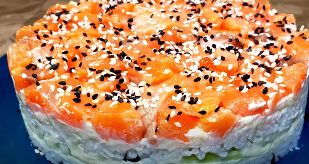Этот салат, вдохновленный популярными суши-роллами «Филадельфия», готовится гораздо быстрее и проще. Сочетание рыбы, сыра, огурца и риса делает его настоящим кулинарным хитом, который оценят даже дети.