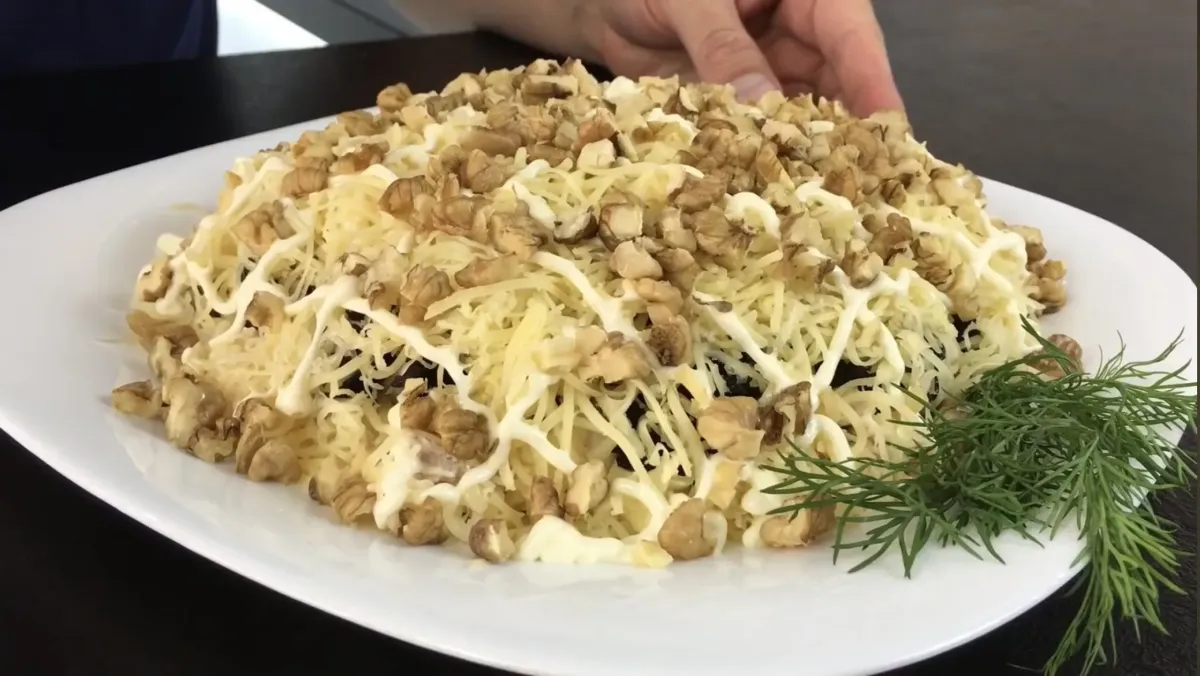 Слои выкладываются в следующем порядке (каждый слой следует промазывать майонезом): грибы с луком, курица, чернослив, сыр и грецкие орехи. Перед подачей охладите салат в течение 1−2 часов, чтобы слои хорошо пропитались.