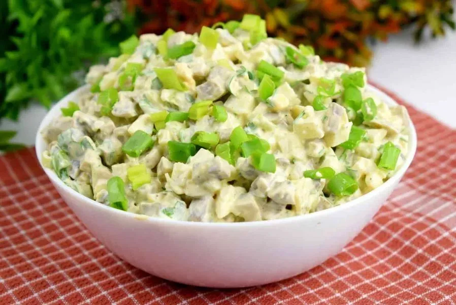 Ваш салат готов! Он получится очень вкусным, сытным и станет настоящим украшением праздничного стола. Приятного аппетита!