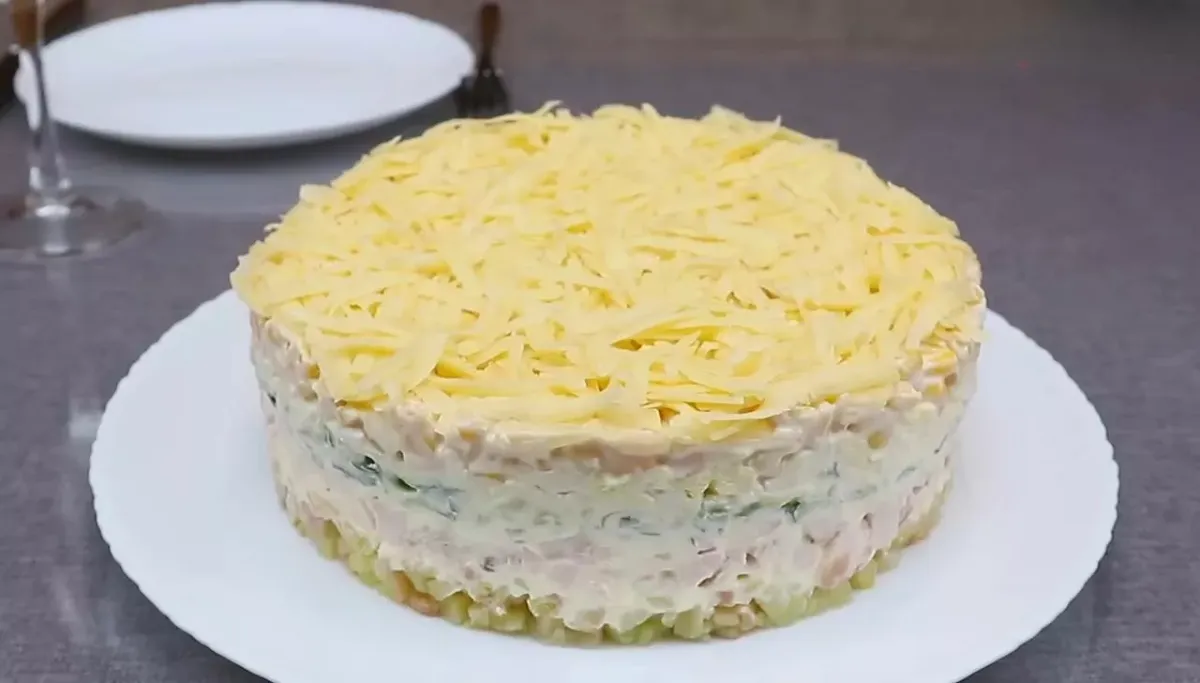 Теперь начинайте выкладывать слои, каждый из которых нужно смазывать майонезом: первым слоем идет кукуруза, затем куриное филе, после — тертые яйца, и в завершение — сыр. Для украшения можно использовать зелень или тертый желток.