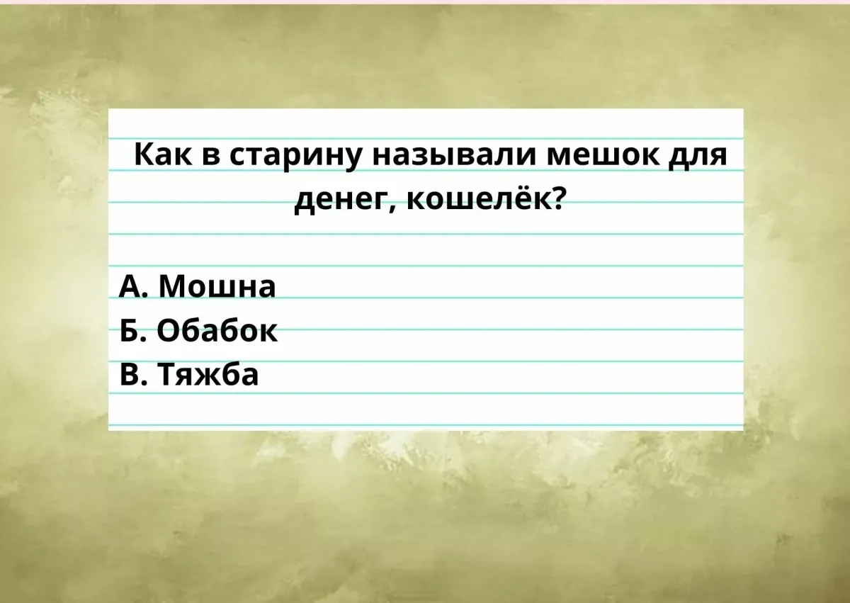 Как в древности называли мешок для денег, кошелёк? Варианты ответов: А. Мошна Б. Обабок В. Тяжба