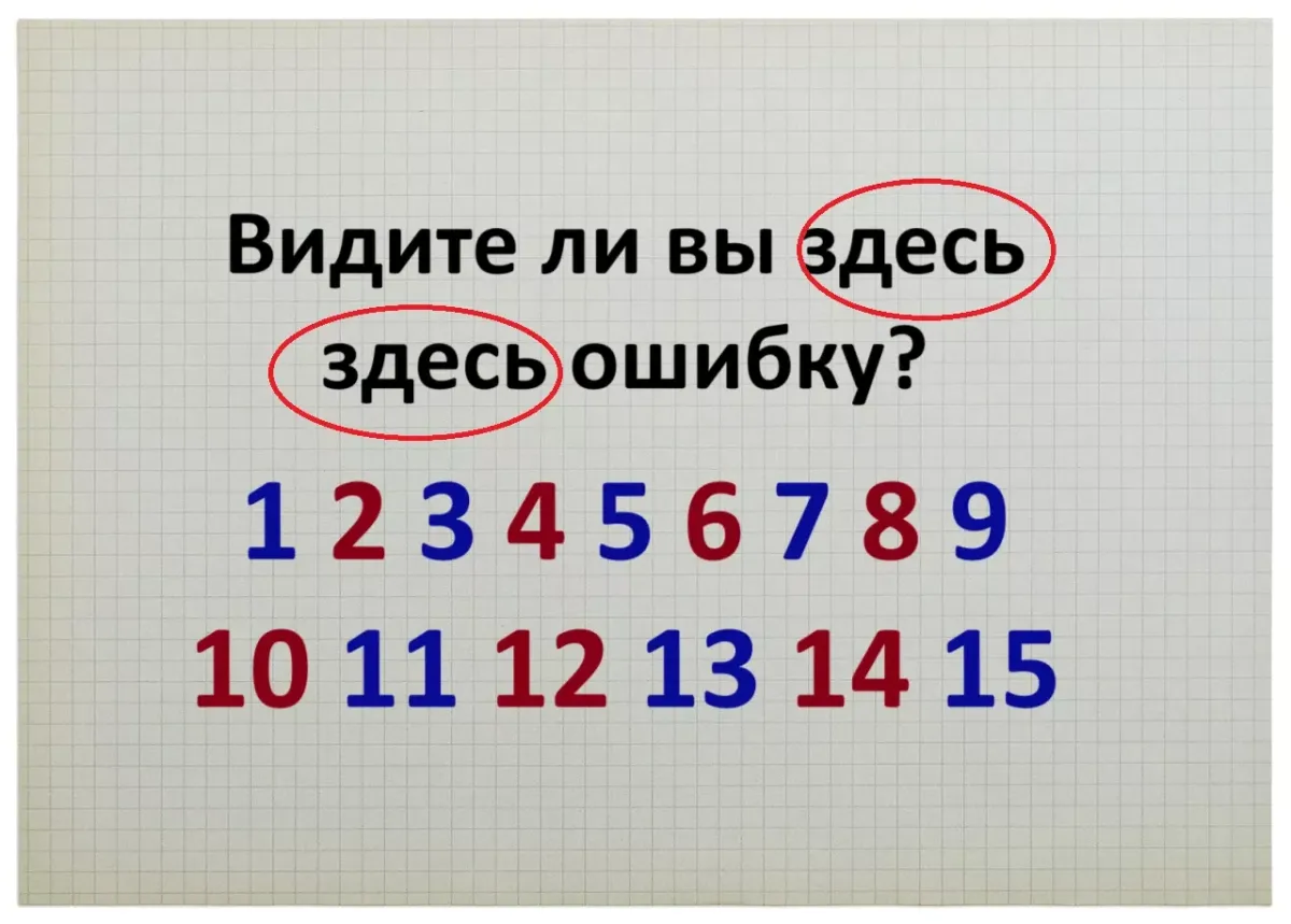 Как видно, ошибка не в числовом ряду, а в самом задании — слово «здесь» написано дважды. Однако это замечают лишь истинные мастера внимательности. Если вы среди них, снимаем перед вами шляпы!