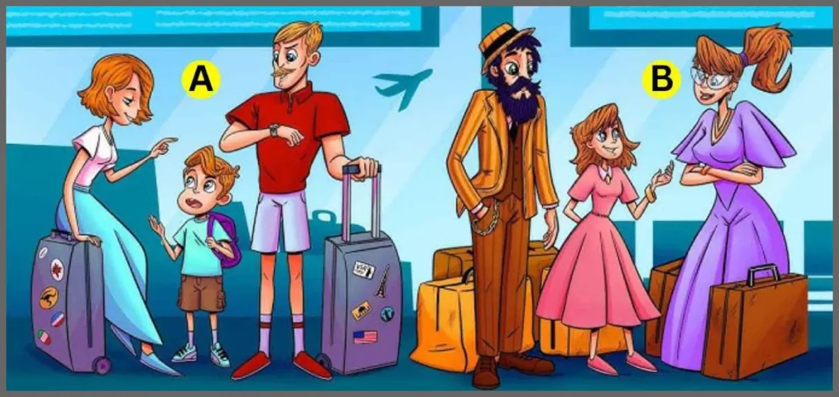 На картинке изображены две семьи, которые собираются в путешествие и находятся в аэропорту. Ваша задача — определить, какая из них является бедной.