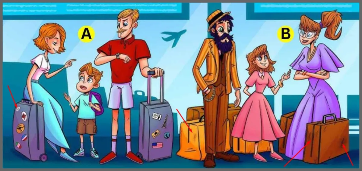 Первая семья, напротив, имеет обычные чемоданы на колесиках, на которых можно увидеть множество наклеек. Это говорит о том, что они часто путешествуют.