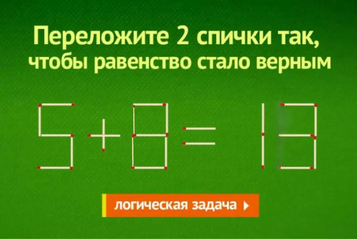 Перед вами равенство: «5+3=18», которое на данный момент неверно. Исправить его можно, изменив положение двух спичек.